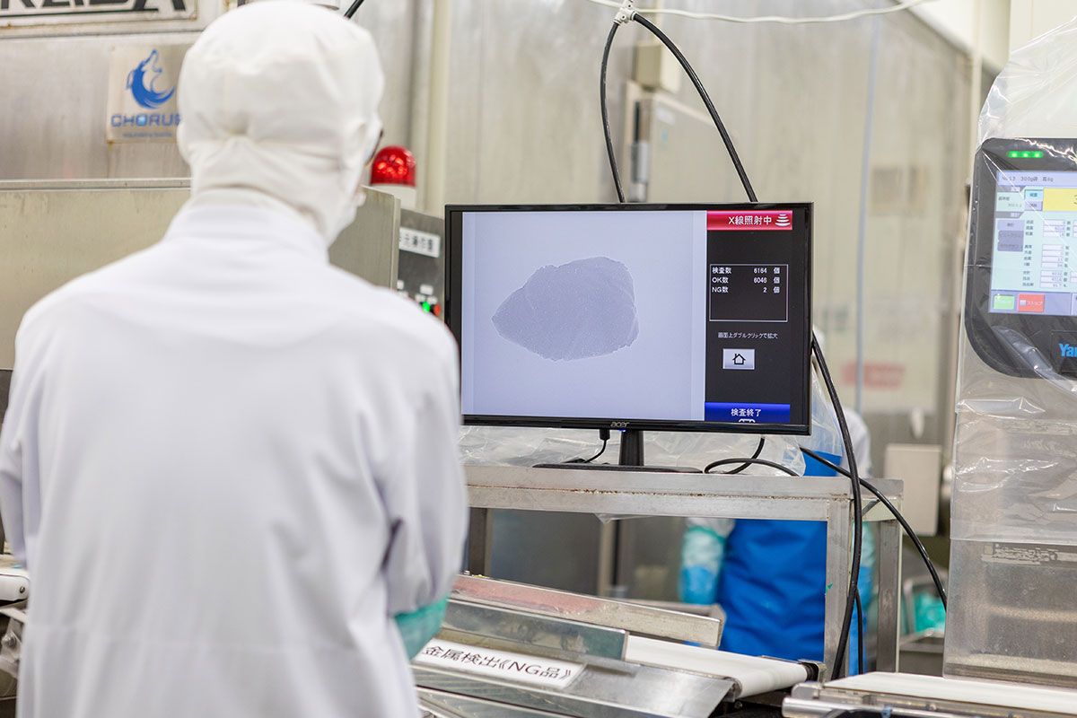 金属探知機、X線検査工程では金属や骨などの硬質異物を排除しています。