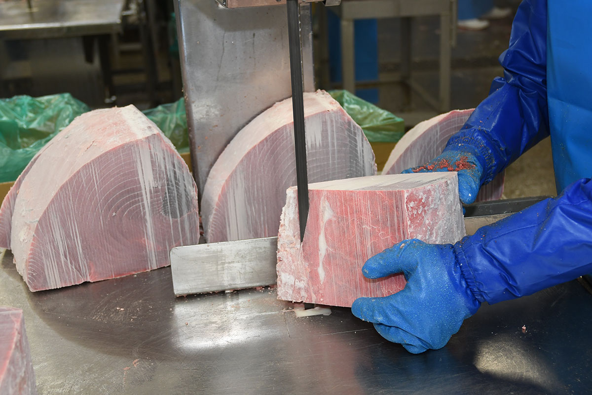 お客さまによって様々に変わる、魚種、身質のランク、好み、加工形状に合わせて二次加工いたします。なかでもまぐろの二次加工品に変色防止は必須!
