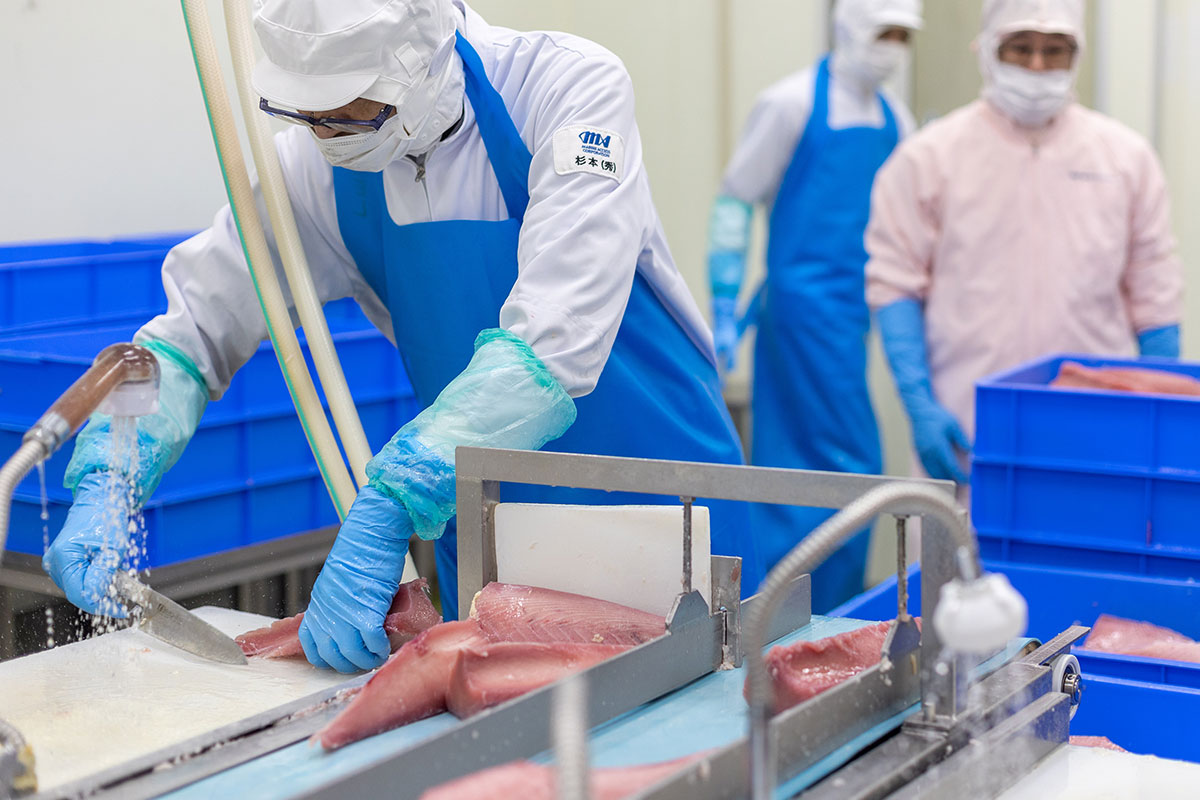 国内4ヶ所に自社工場を有し、調達した水産物は原料用にカットする一次加工はもちろん、刺身や寿司商材など、様々な形状へ二次加工も行います。